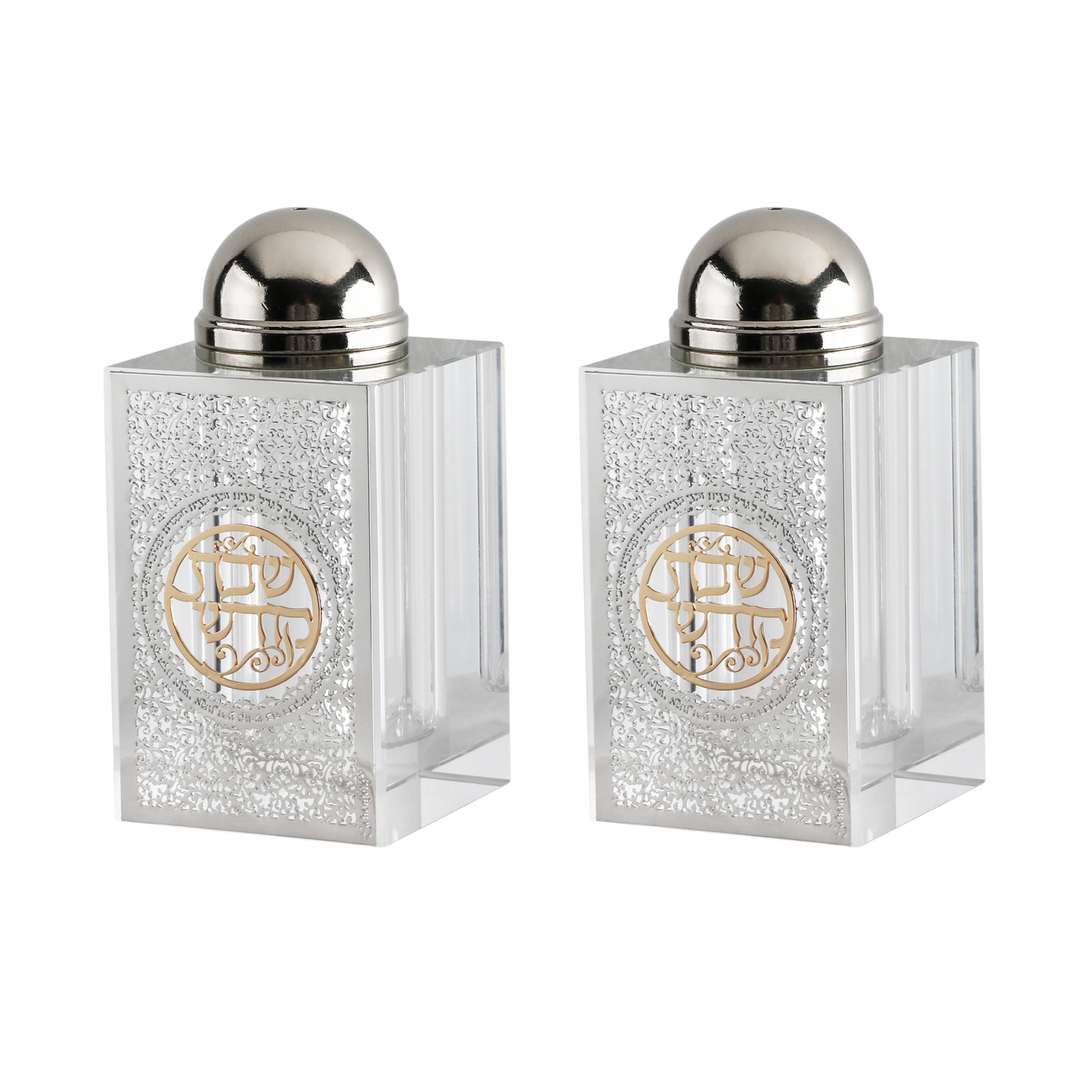 Crystal Salt & Pepper Set Silver Floral with Gold Shabbat Kodesh 3"HX1.5"
