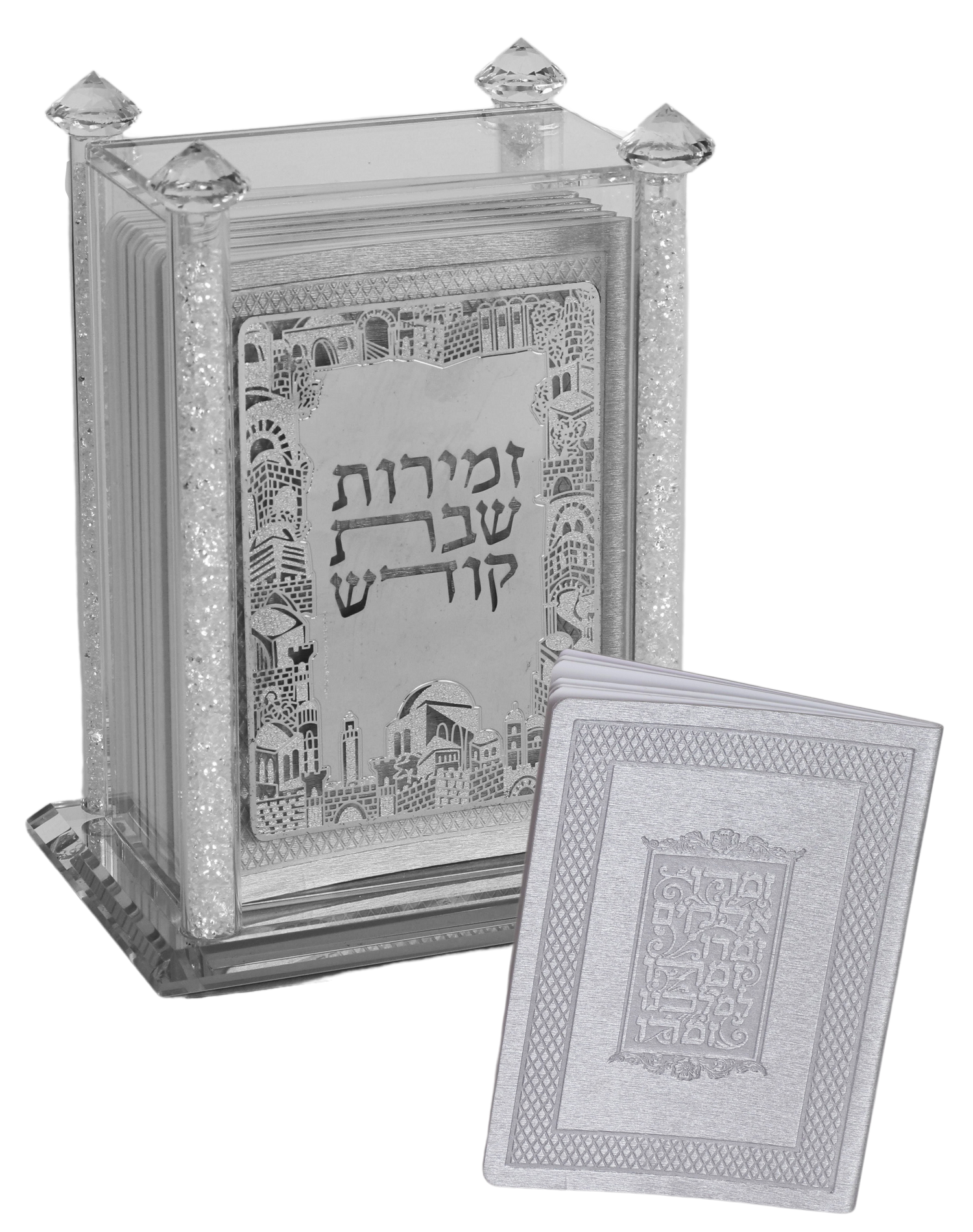 Crystal Zemiroth Holder With Jerusalem Silver With 6 Leather Zemiros 8"HX6X4"