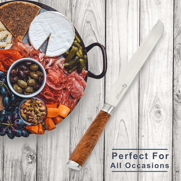 This high class bread knife with its sandalwood handle is the ideal choice! Elegant & practical all in one! Available in 2 blade options: fine edge or serrated to suit all preferences.